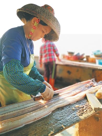 在海头,家家户户都会做鳗鲞,每家每户也都有自己制鲞的方法。将新鲜鳗鱼捕捞上岸后,渔娘史小丽通常会先洗净鱼外皮上的粘液,随后将其平放在长木板砧上,在头尾两端钉上铁钉,以防滑动。