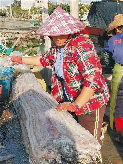 冬至前后,阳光浓而不烈,西北风清而不寒,正是风干鳗鲞的最佳季节。海头港的岸边空地上,史小丽撑起一排排竹竿,将一条条约两米长的鳗鱼摊开,白中带粉的鱼肉挂着水珠,在阳光的照耀下铮铮发亮。