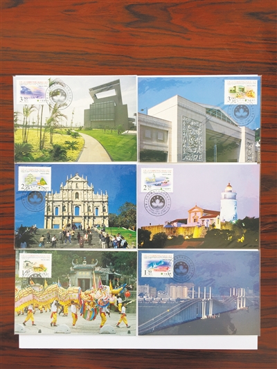1999年12月20日,澳门回归祖国这一天,发行了《中华人民共和国澳门特别行政区政府成立纪念》邮票6枚,分别选取了松山灯塔、大三巴牌坊、友谊大桥、综艺馆、文化中心、妈阁庙六处代表中西文化的建筑作为主图。