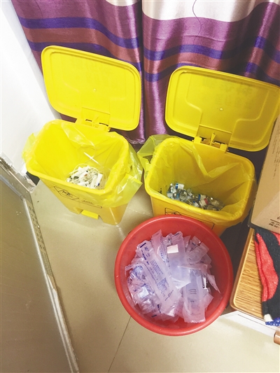 在输液室里,记者还看到了墙边摆放的4个垃圾箱,它们被套上黄色、红色和黑色的塑料袋,分别放置医疗垃圾和村民的生活垃圾,还有一些空纸盒统一放在一个纸箱里。输液室里还放着一张输液床和几张椅子,空间小而不乱。