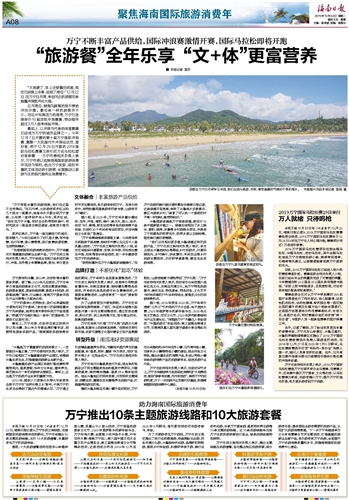 “在海南国际旅游消费年活动中,万宁将重点打造健康旅游新业态新产品。”万宁市旅文局相关负责人表示,万宁将结合目前已经形成的骑行、冲浪、龙舟等文体赛事品牌,策划、举办更多的节庆主题活动,吸引游客来到万宁。在举办活动中,将特别重视提高游客的参与度,让游客尽兴“嗨玩”。