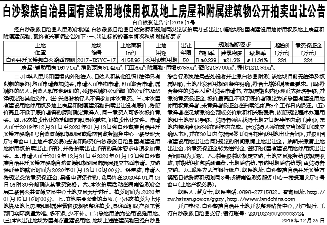 白沙黎族自治县国有建设用地使用权及地上房屋和附属建筑物公开拍卖出让公告