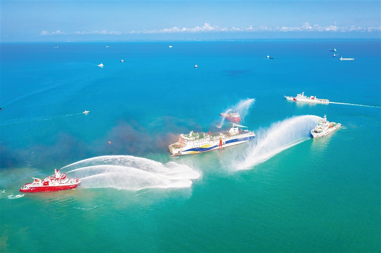 琼州海峡是海南连接广东、辐射全国的重要通道,琼州海峡客滚船每年运输约1500万旅客、300万车辆,承担了海南岛内90%生活物资进出需求,是海南省人员、物资进出岛的主要交通方式之一。本次演练参与力量包括海事、救助、海警、消防救援、省农业农村厅、海口市政府、海南港航、海南海峡股份、中海油湛江分公司等单位所属的23艘船艇、1架救助直升机、2辆120急救车,转移旅客200人,参演总人数超过800人。演练全面调动了各成员单位力量,全方位加强了省、市两级联动,体现了各成员单位的协调配合与责任担当。