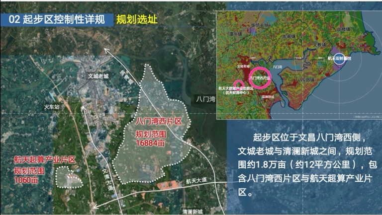 海南文昌国际航天城具体包括两个部分,即航天发射场配套区和起步区。其中,起步区位于文昌八门湾西侧,文城与清澜之间,规划范围约1.8万亩,包含八门湾西片区与航天超算大数据产业集群片区,周边有文清大道、航天大道、滨湾路等多条城市主干道,周边“五网”建设完善、交通便捷。航天发射场配套区主要布局国家重大项目、新一代运载火箭、商业航天等发射及相关配套产业,以及航天文化旅游产业等。