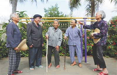 “现在是国家在养着我们,没有什么不满意的。”吴月琼与几个老人边在健身器材上锻炼身体,边笑着说。