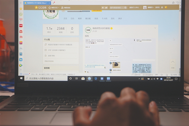 “墙墙,觉得自己很孤独怎么办”“墙墙,有没有周六一起考英语口语的小伙伴,大家可以一起拼车啊” “墙墙,我的伞掉到公共楼下了,帮我问问有没有同学捡到……”每天,海南师范大学“万能墙”的创建运营者李纹(化名)都会收到几十甚至数百条投稿。投稿内容包括寻物启事、表白、提问、感谢、吐槽等。他需要整理汇总这些信息,然后发布到设立在QQ空间的“万能墙”上。