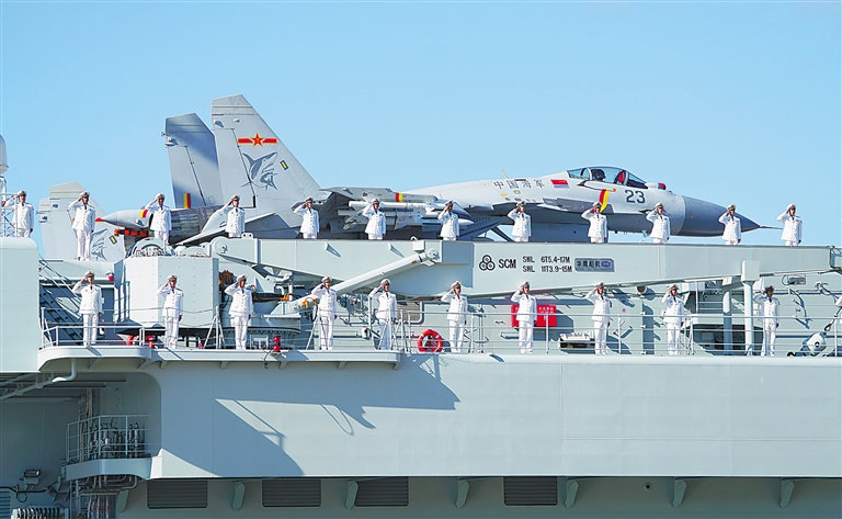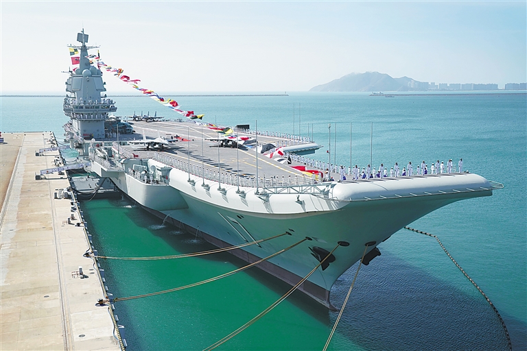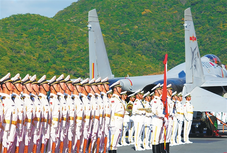 南海之滨的三亚,水天一色,日暖风清。军港内,山东舰伏波静卧、满旗高悬,来自海军部队和航母建设单位的代表约5000人在码头整齐列队,气氛隆重热烈。