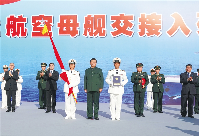 我国第一艘国产航空母舰山东舰12月17日下午在海南三亚某军港交付海军。中共中央总书记、国家主席、中央军委主席习近平出席交接入列仪式。