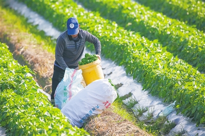 时下,海南冬季瓜菜陆续上市。在琼海市博鳌镇,农民忙着在田地里采摘辣椒。