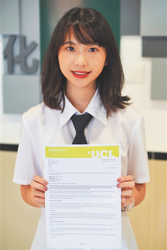 而在2019年12月19日,符蓉还收获了一个更大的喜讯——收到来自世界顶级十强名校英国伦敦大学学院的录取通知书。