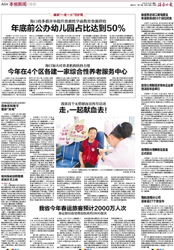 “我们今年计划新建29家老年人日间照料中心,并对5家农村敬老院进行升级改造,提升居家和社区养老服务整体水平。”海口市民政局相关工作人员介绍,今年海口将增加财政资金投入,逐步放宽服务对象准入条件,同时出台养老服务事业各项优惠政策,加大对养老机构的扶持力度。此外还将通过培训和招聘等途径,提升全市养老服务业质量水平。