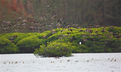 1月1日,在位于临高县境内的海南新盈红树林国家湿地公园,栗树鸭成群栖息。