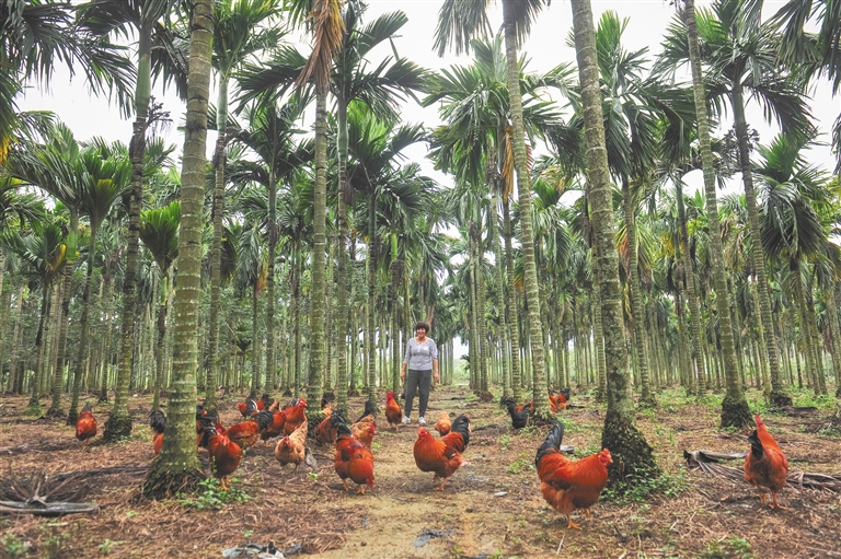 答案是槟榔。海南人种槟榔、吃槟榔的风俗历史悠久,苏东坡被贬海南时曾描绘黎家少女口含槟榔头插茉莉花的情景,写下“暗麝着人簪茉莉,红潮登颊醉槟榔”的传世佳句。