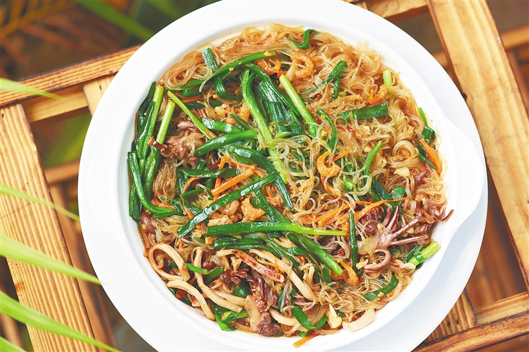 万宁人善于组合不同的食材,把那些不起眼的食材也做成美味佳肴。龙滚菜的主料是粉丝和韭菜,但油爆香的鱿鱼干和虾米是提升这道菜鲜香的关键。炮弹鱼肉质粗硬,但在加入五花肉和萝卜干炖煮后产生了奇妙的变化。哪怕是最常见的通心菜,万宁人也能吃出花样。在物质不丰富的年代,酿酒剩下的糟粕也不能浪费了,通心菜滚水烫过,马上放到凉水里泡着才能保持青翠欲滴的色泽,捞起扭干水分,切成小段,淋上糟粕,这是基础版的腌通心菜。不同的人家会根据不同的嗜好给这碗腌通心菜注入不同的灵魂,炖肉的肉汁和煲鱼的鱼汁添到通心菜里,那可是完全不同的味道。