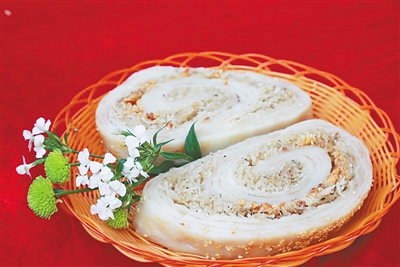 在海南,用糯米与椰子做的各种粿很多,一条就有一米多长、重量超过15斤、形似猪肠的万宁猪肠粑在其中可谓霸气侧漏。万城镇北门村的猪肠粑是当地人认可的正宗货。运气好的话,上午7时许,在万城镇红专东路与解放路的交界路口,会碰到北门村的严家兴老师傅推着自行车,在这里售卖刚出炉的猪肠粑。横切出一块猪肠粑,白糖煮过的椰丝油亮晶莹,炒熟的花生米和芝麻被层层白而柔软的糍粑紧紧包裹,咬上一口,糯米和椰丝的香味,立即就能让你口舌生津。