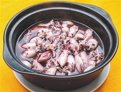 万宁人有着敢闯敢干的精神,这在万宁饮食上也有所体现。西餐中的鱿鱼墨汁饭、墨汁意大利面颇受欢迎,万宁人也发现了墨汁的鲜美和营养价值,但烹饪手法是粗犷的、也是大胆的。选用两个拇指大小的新鲜鱿鱼,不去墨汁洗静后直接入锅水煮,一锅乌黑的墨汁汤泡着圆滚饱满的小鱿鱼,别看卖相有点吓人,吃起来可是鲜掉眉毛。