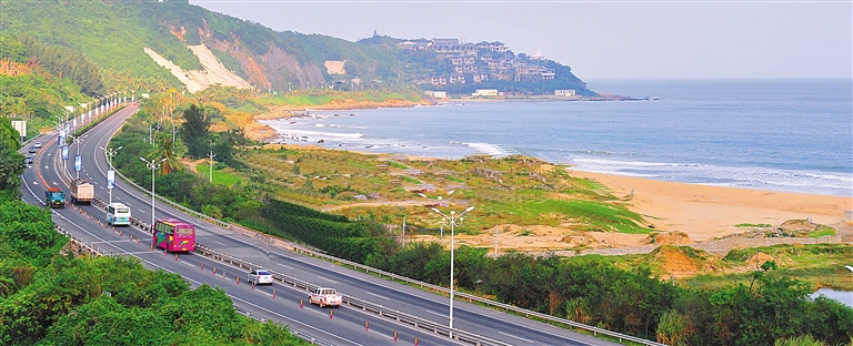 沿盘山公路蜿蜒向上,牛岭植被覆盖茂密,常绿和落叶乔木、灌木草地渐次分布,景色虽美,在山峦纵横、满目皆绿的琼岛倒也稀松平常。待登上半山腰的观海亭,咸湿的海风夹杂着轰鸣海浪声扑面而来,山海相拥间终于铺开了一张波澜壮阔的巨幅画卷。