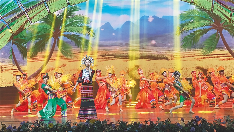 海南日报记者了解到,《黎族丰收乐》曾于2019年斩获第二届海南省原创广场舞比赛表演一等奖和最佳编排奖,主要内容是再现黎族同胞欢庆丰收的喜悦场景。根据本届全国少数民族春晚导演组要求,该节目编导将原本由演员集体表演统一动作的广场舞形式,改编成了既有双人舞和集体舞,又有歌手领唱的新版本,使得整个节目画面层次丰富,动感和乐感增强,歌与舞完美融合,而且与整台晚会欢快、喜庆、祥和的氛围非常协调。特别是海口市舞蹈家协会的领舞、领唱和群舞演员表现出众,舞台效果一流,使该节目得到晚会导演组多次表扬。