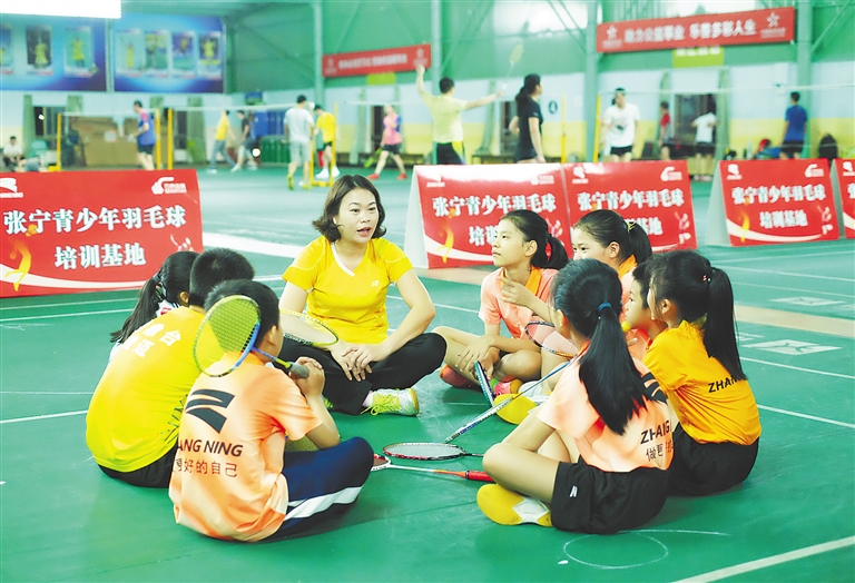1月7日下午,澄迈县金江镇富朗村万泰体育馆内,一群小运动员们正在紧张训练,为即将到来的澄迈“迎春杯”系列体育赛事做准备。在一群小队员中间,身着亮黄色运动装与孩子们交流球技的潘少丹,十分显眼。