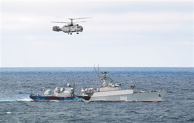 1月9日,在克里米亚半岛附近的黑海海域,俄罗斯舰船和直升机参加演习。