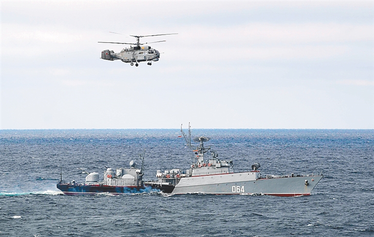 俄罗斯北方舰队和黑海舰队9日在克里米亚半岛附近的黑海海域举行大规模联合演习,俄总统普京现场观摩演习。 新华社/美联