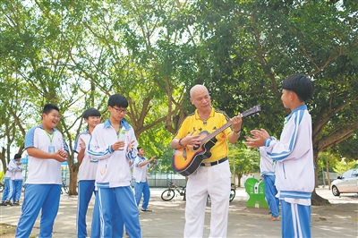 对于陈育忠而言,热爱音乐的人,从来不缺对生活的热爱。这些年来,陈育忠热爱音乐、热爱校园的初心始终不改,在他的张罗下,学校成立了学生课外兴趣小组,他利用课余时间,教学生们弹吉他、拉二胡、弹唱电子琴等,既培养了学生们的课余爱好,也让师生感情更为融洽。尤其是自进入不惑之年后,陈育忠也开始尝试创作海南方言歌曲来表达对生活、对校园的热爱。