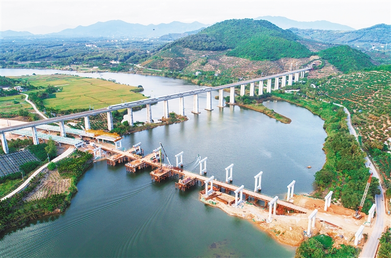 1月8日,俯瞰五指山至保亭至海棠湾高速公路(山海高速)南田藤桥东河大桥施工现场。桥梁桩基工程已经完成,正在进行墩柱、盖梁及架设箱梁施工。