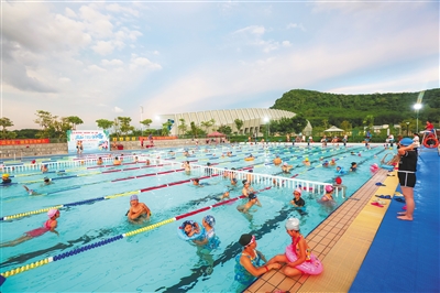 2019年8月12日,白沙文化体育中心游泳池吸引众人享受游泳乐趣。2019年,全省新建城市数字影院13家、乡镇影院8家、文化活动场所185个、文化活动室204个、简易戏台177个,加快建设贫困地区行政村的综合文化服务中心206个,让群众休闲娱乐有了好去处,不断满足人民对精神文化生活的新期待。 本报记者 袁琛 摄 |