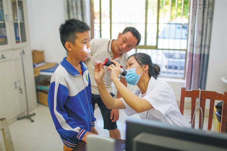 2019年10月23日,白沙黎族自治县南开乡卫生院,该院医生潘红宇在给病人看病。