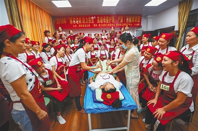 2019年10月14日, 在省工会职工培训中心举办的”精准培训、助力扶贫”高级母婴护理技能培训班上,来自全省各地的学员正在学习产后康复腹部护理课程。 据了解,省总工会把职业技能培训作为推动精准扶贫工作的有力抓手,通过培训进一步提高下岗职工、农民工、贫困户、低保户以及城市困难群体的就业技能水平,增强贫困劳动力的“造血功能”,助力全省脱贫攻坚工作。目前,免费母婴护理技能培训班已成功举办89期,培训6000多人。