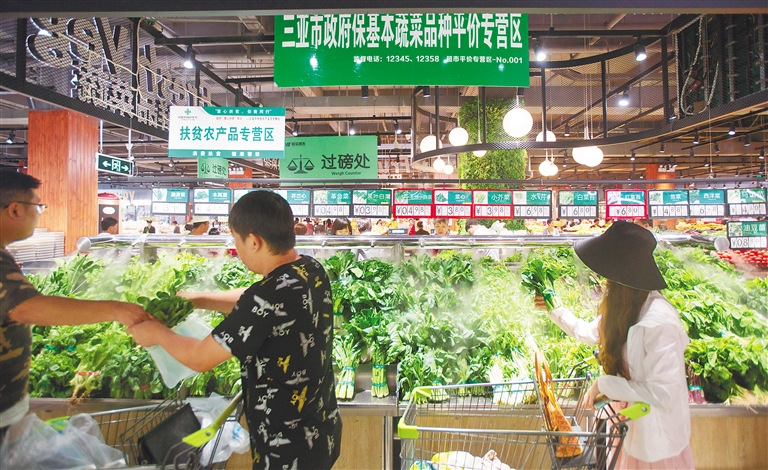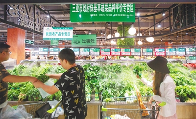 1月2日,市民游客在三亚市胜利路购物广场旺豪超市内政府保基本蔬菜品种平价专营区选购蔬菜。 2020年元旦春节期间,三亚计划在74个平价网点15个大中型超市投放蔬菜和猪肉,多措并举做好 “菜篮子”保供稳价工作,切实保障人民群众基本生活需求。