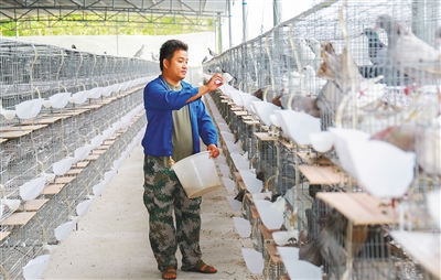近日,在临高县波莲镇的种鸽养殖基地,饲养员正给种鸽喂食。