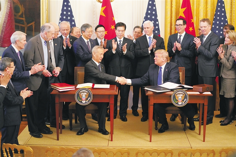 刘鹤在协议签署仪式上表示,作为国际事务中负有重要责任的两个伟大国家,正视分歧、管控分歧,达成第一阶段经贸协议,有利于中国,有利于美国,有利于世界。这是一份互利共赢的协议,能够稳定全球经济发展,促进世界和平与繁荣,符合两国生产者、消费者和投资者的利益。同时,协议不针对也不影响第三方的合法权益,符合世贸组织规则。
