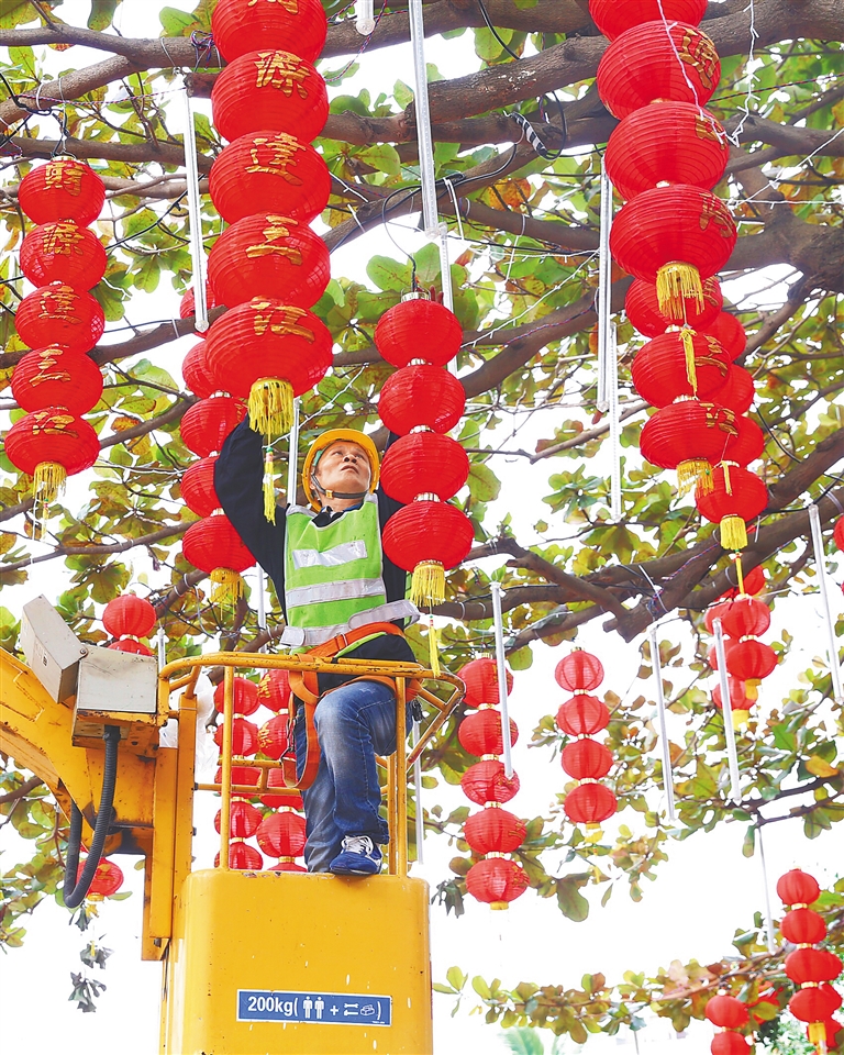 近日,春节临近,在海口市府城镇,市政工人将一串串红灯笼悬挂在树上,红红火火喜迎新春。据了解,为了营造社会和谐、家庭幸福的喜庆祥和节日氛围,海口市大街小巷陆续悬挂包括社会主义核心价值观等元素的传统灯笼,喜迎新春佳节的到来。