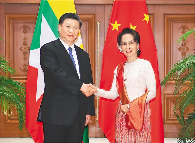 昂山素季再次热烈欢迎习近平主席对缅甸进行国事访问。她表示,缅方高度珍视缅中友谊,希望继续做中国的好朋友。习近平主席这次访问具有里程碑意义,成果丰硕,将极大深化缅中胞波情谊,促进两国务实合作。缅方愿积极推进缅中经济走廊建设,全力落实皎漂项目,加快推进交通、能源、产能、人文、边境、地方等领域合作。缅方愿同中方携手前行,共同构建缅中命运共同体,更好造福两国人民。