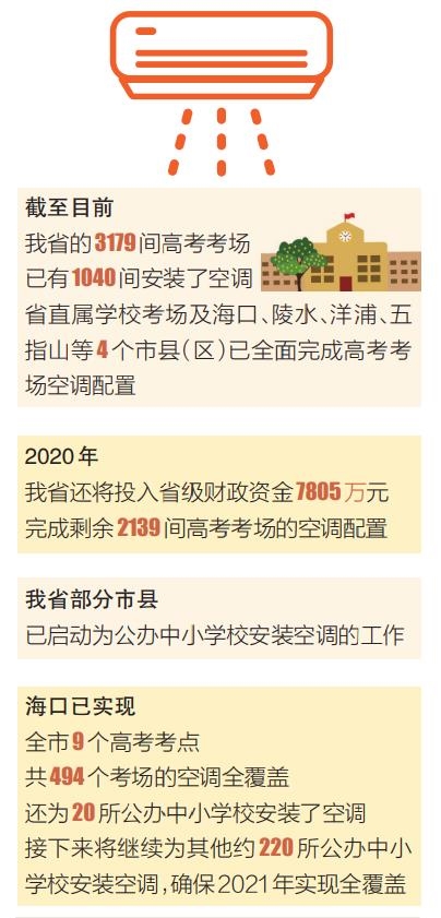 海南日报记者了解到,去年5月,省教育厅向各市县教育部门印发了《关于做好高考考场配置空调的通知》,要求各市县及时为高考考场配置空调,具备条件的市县应在当年完成;当年6月和10月,省教育厅又分别印发通知,对各市县相关情况进行调研摸底,并组织人员到实地了解工作重点和难点,为全面推进高考考场空调全覆盖工作打下基础。