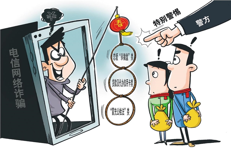 ——恋爱“杀猪盘”类诈骗。春节期间,“催婚”是常见话题,不少人在此期间婚恋情感需求强烈,容易被骗子蒙蔽。2019年春节期间,花女士通过网络与一名“外地男子”邂逅并陷入热恋。此后,该男子以“可以结束异地恋”“长相厮守”等情感原因为借口,向花女士索取65万元“冲业绩”周转金。这笔钱进入了骗子的“腰包”。若非警方及时介入,花女士就将陷入人财两空的困境。