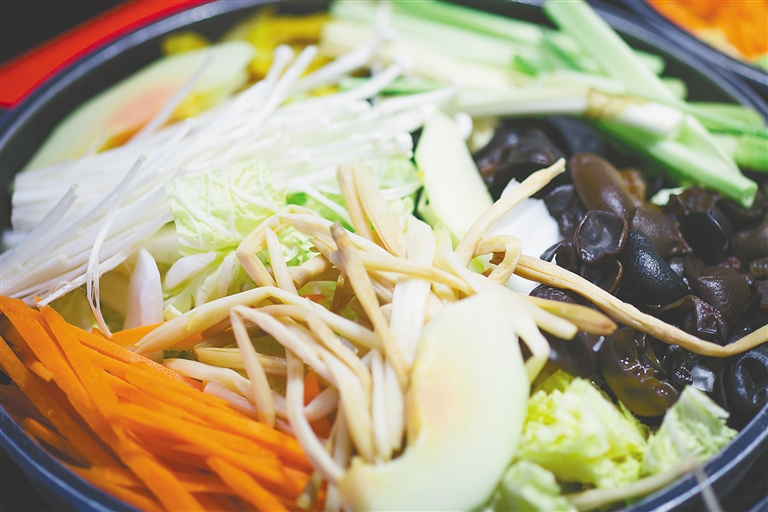 而说起素菜之于过年的深刻含义,还要看海口人餐桌上的那道斋菜煲。斋菜煲中以黄花菜、腐竹、粉丝、冬菇、水芹、青蒜、甜菜等素菜作为主料,煲一开锅,可谓香飘四溢。斋菜的原材料大都根据蔬菜名字的谐音,如甜菜,寓意甜甜蜜蜜,生活美满;青蒜,寓意能说会算,不会吃亏……因此海口人的惯例是在新春佳节特别是正月初一的时候吃这道菜,意在讨一个喜庆吉利。