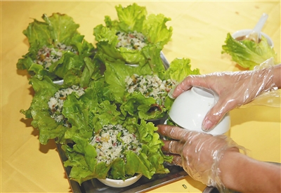 火候,就是等到米饭的颜色即将变成金白色时,调小火,用余温快速翻炒饭菜,颜色变了之后赶紧出锅,容不得半点马虎。“米饭可不能烧焦,这会失去整个菜包饭的美味。”莫渊海说。