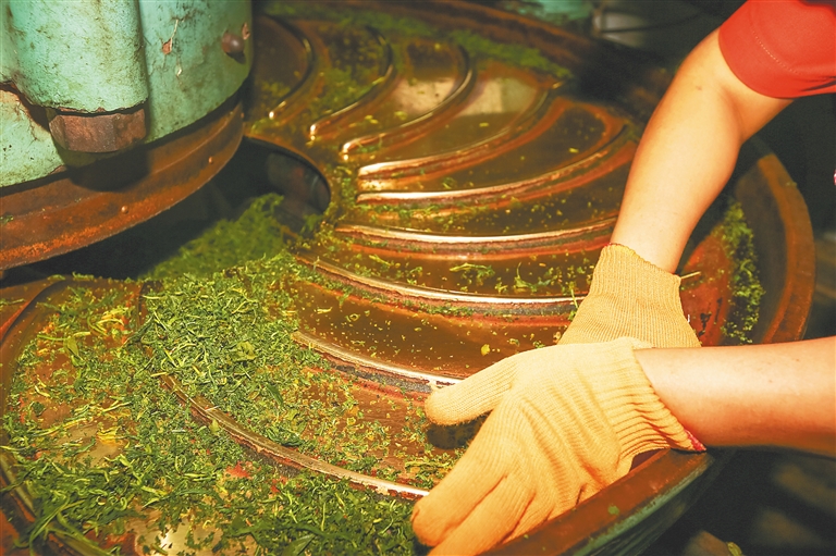 萎凋完成后,鲜叶就要送入下个车间进行杀青。“杀青,顾名思义就是去除鲜叶本身的青味、涩味,并把茶叶的发酵过程停住,就像相机‘咔嚓’一声,定格画面,茶的种类因此确定下来。”在杀青车间,职工们将茶叶堆上传送带。略带草青味的叶片随着带子缓缓向前,最终落入锅炉中。
