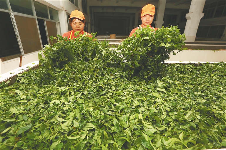 制作早春茶,第一步便是要萎凋。茶女们将刚摘下的鲜叶放入萎凋槽中,均匀铺平。任由槽下的鼓风机运转,吹干鲜叶上的水分,并降低叶片的含水量。“这一步,一是为了防止鲜叶堆积变质,二是可以减少鲜叶的含水量,便于下一步加工。掌握好茶叶萎凋的时间和程度尤为重要。”符小琴介绍,如果鲜叶内含水量过高,揉捻时容易断碎,制成干茶易断碎,片末多。但萎凋过度,叶片内含水量过少,揉捻时难以成条,导致色泽灰枯不显毫。