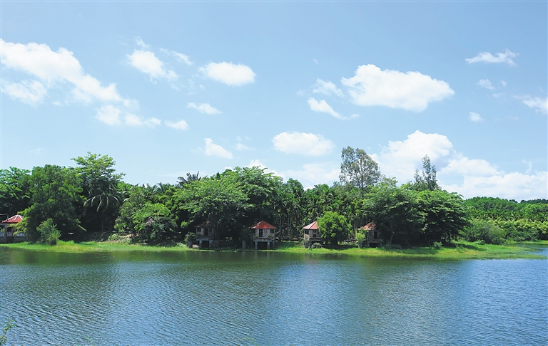 走进会山镇沐塘村的加脑村民小组,仿佛走进了一幅美丽的画卷:鹅卵石铺就的小道一直伸向“朋莱湾”,万泉河水从冠盖亭亭的河滨休闲园林中流淌而过;村中竹园曲径通幽,一间茶室隐秘其中,品一杯五月茶,听着一旁的射弩场不时传出的欢笑声,颇有归园田居之感。在村中的哖嗦(苗语“吃饭”)苗家乐,一张长桌摆满了会山特色农家菜,加脑鹅、万泉河鱼、五脚猪、特色野菜可以让你大快朵颐了。