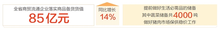 在保障生活必需品市场供应方面,针对粮、油、肉、菜、蛋等重要生活必需品,我省充分发挥大中型商贸企业和主要生产企业在稳定市场供应中的积极作用,建立了应急保供骨干企业队伍,指导企业在商业周转库存的基础上适当增加应急保供库存,保障市场供应。