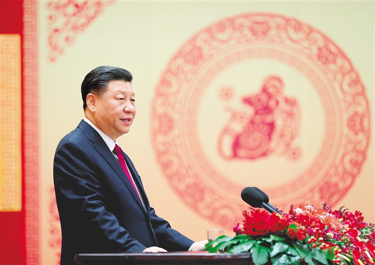 团拜会上,习近平等党和国家领导人同大家亲切握手,互致问候、祝福新春。文艺工作者表演了精彩的节目。