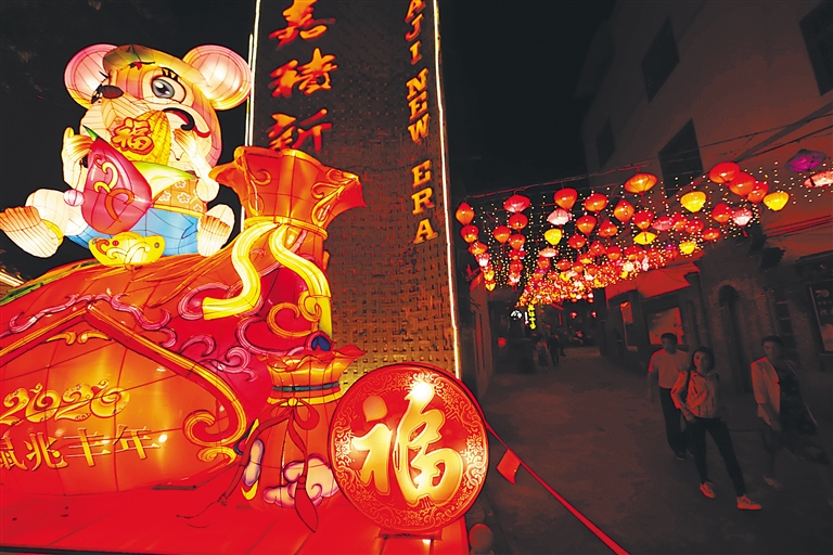 1月22日,人们在琼海市嘉积镇溪仔老街观赏彩灯。