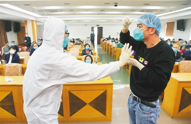 1月26日下午,自愿“请战”加入流行病学调查队伍的海南医学院师生及省疾控中心应急处置工作队工作人员共130人,在省疾控中心进行新型冠状病毒感染的肺炎防控工作培训。 此次培训旨在规范新型冠状病毒感染的肺炎防控工作,提高一线流调人员流行病学调查水平和做好个人防护的能力。 截至目前,该中心已开展内部全员培训6次,新增的应急队员应急演练5次,开展全省疾控工作人员视频培训3次。 图为两位学员在示范穿戴防护服。 本报记者 苏晓杰 摄 图为两位学员在示范穿戴防护服。 本报记者 苏晓杰 摄