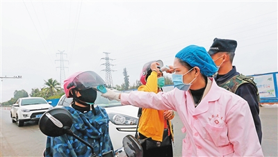 1月26日,在洋浦经济开发区,医护人员和警察为进出洋浦的市民游客测量体温。本报记者 陈元才 特约记者 郝少波 摄