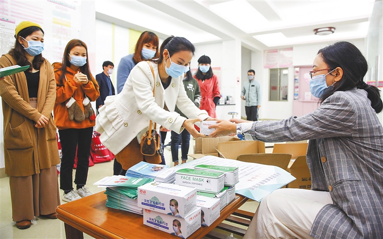 1月27日,首批5万个防护口罩运抵海口市琼山区甲子镇,参与疫情防控工作的基层工作人员免费领取口罩。本报记者 张茂 摄