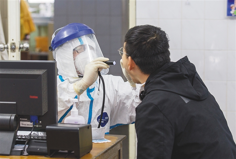 1月27日,三亚中心医院发热门诊医护人员为前来就诊的群众进行初步诊断。 本报记者 武威 摄