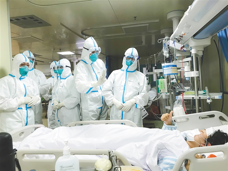 1月27日,一名新型冠状病毒感染的肺炎患者为海军军医大学医疗队点赞。 新华社发(陈静 摄)